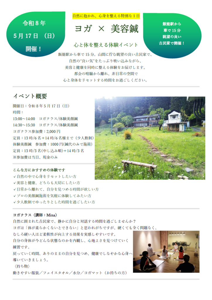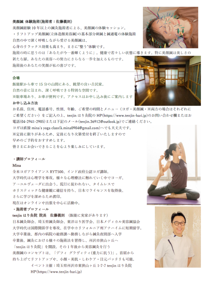 飯能市の古民家での、「美顔鍼の体験施術」と「ヨガクラス」のコラボ企画です、参加をお待ちしています!